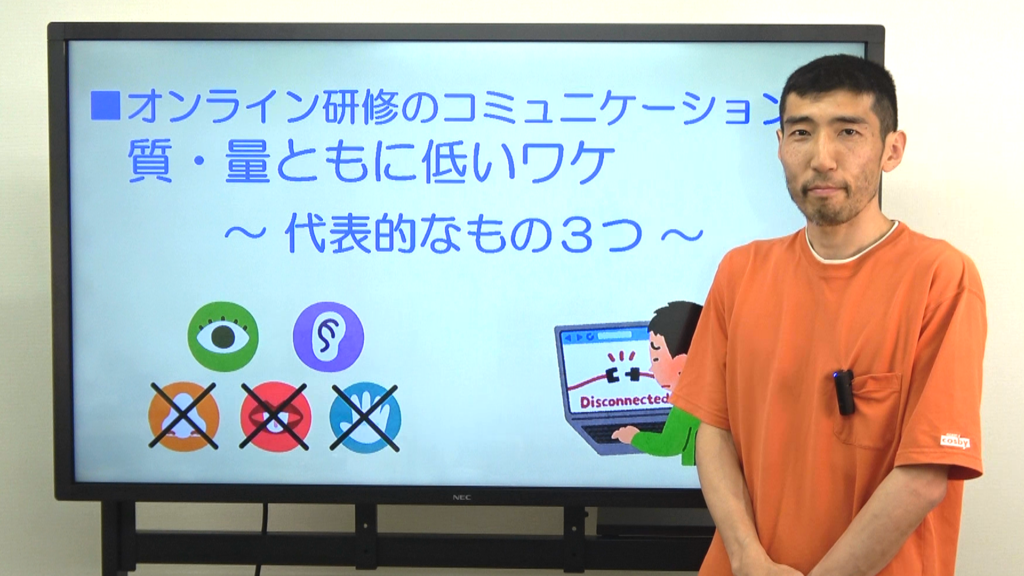それに対して、オンライン研修は、PCやスマホの画面の映像と器機を通した音声に限定されたコミュニケーション。つまり視覚と聴覚のみのコミュニケーションです。